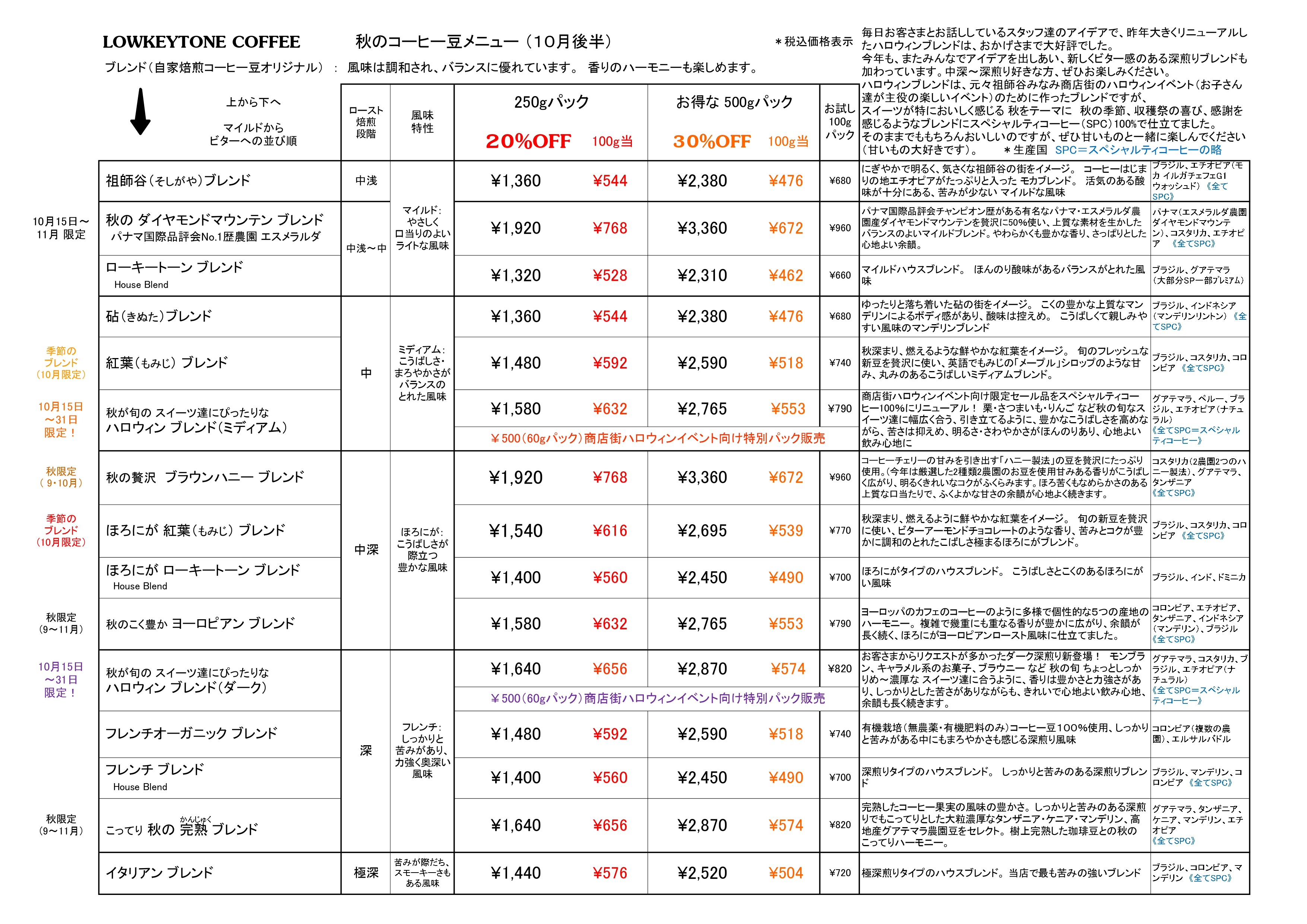 10月のコーヒー豆一覧表(ブレンドコーヒー編)